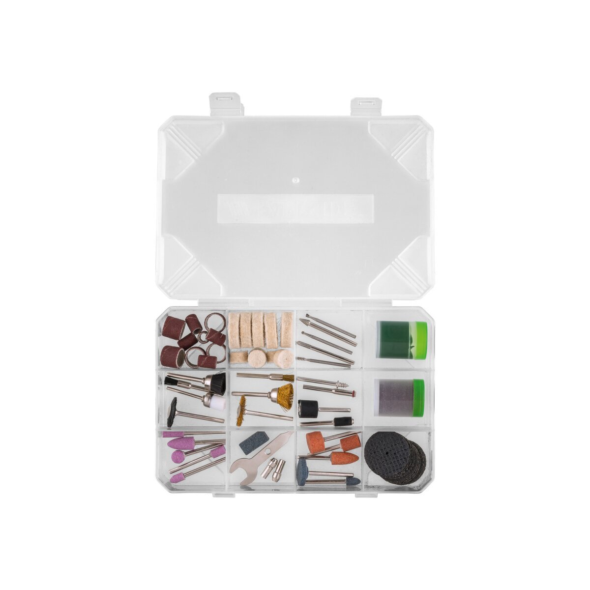 • Mitgeliefertes Zubehör (in Aufbewahrungsbox): 12 Trennscheiben (32 x 1 mm). 5 Schleifbänder (13 mm. Ø 15 mm). 5 Schleifbänder (13 mm. Ø 9 mm). 5 Polierfilzpads (7 mm. Ø 25 mm). 5 Polierfilzpads (7 mm. Ø 13 mm). 40 Trennscheiben (Ø 24 mm). 10 Schleifmaschinen. 3 HSS-Fräser. 2 Oberfräsen. 4 Reinigungsbürsten. 3 Messingbürsten. 2 Spanndorne zum Schleifen Maschinenbänder. 1 Spanndorn für Polierfilzpads. 1 Spanndorn für Trennscheiben. 1 Abrichtstein (20 x 10 x 10 mm). 1 Polierpaste. 3 Spannfutter für biegsame Welle (2.0/2.4/3.2 mm)